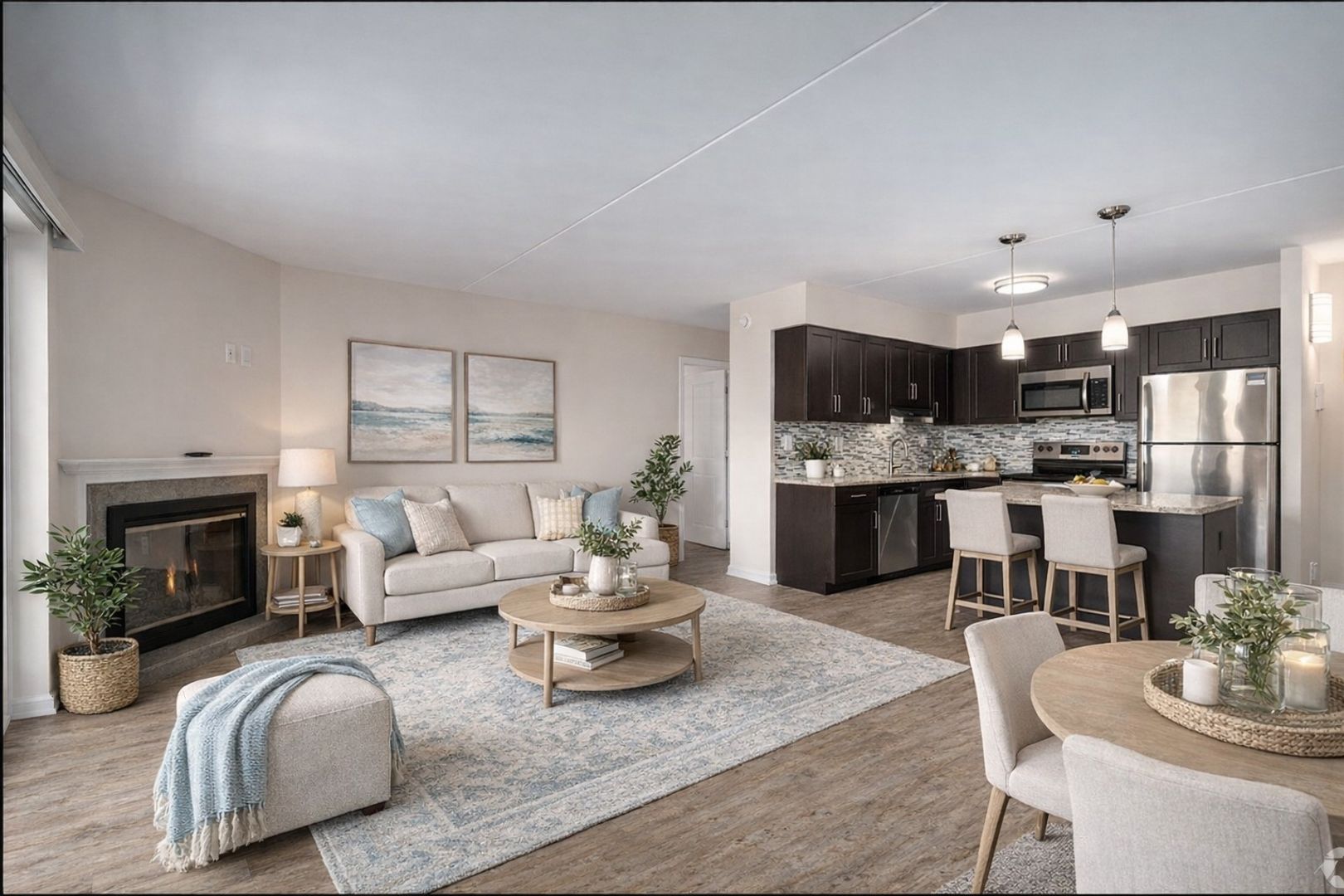 Our units have been completely renovated to meet today’s standards of living. Offering fully equipped kitchen with stainless steel appliances, including; refrigerator with ice maker, stove with self cleaning oven, stovetop microwave, dishwasher, garbage disposal, quartz counter tops with tile back splash, ample cabinetry with soft closing mechanisms, and kitchen islands with pendant lights. Vinyl plank flooring in the kitchen and living room are contrasted with new carpeting in the bedrooms with walk-in closet. There is also a linen and coat closet, and full size washer & dryer in the unit. Ceramic tile in the bathroom and a full size vanity with quartz countertop finish off a contemporary style in each apartment. Each unit also has its own balcony/patio with a spacious storage closet. Second and third floor units have non-functioning fireplaces.