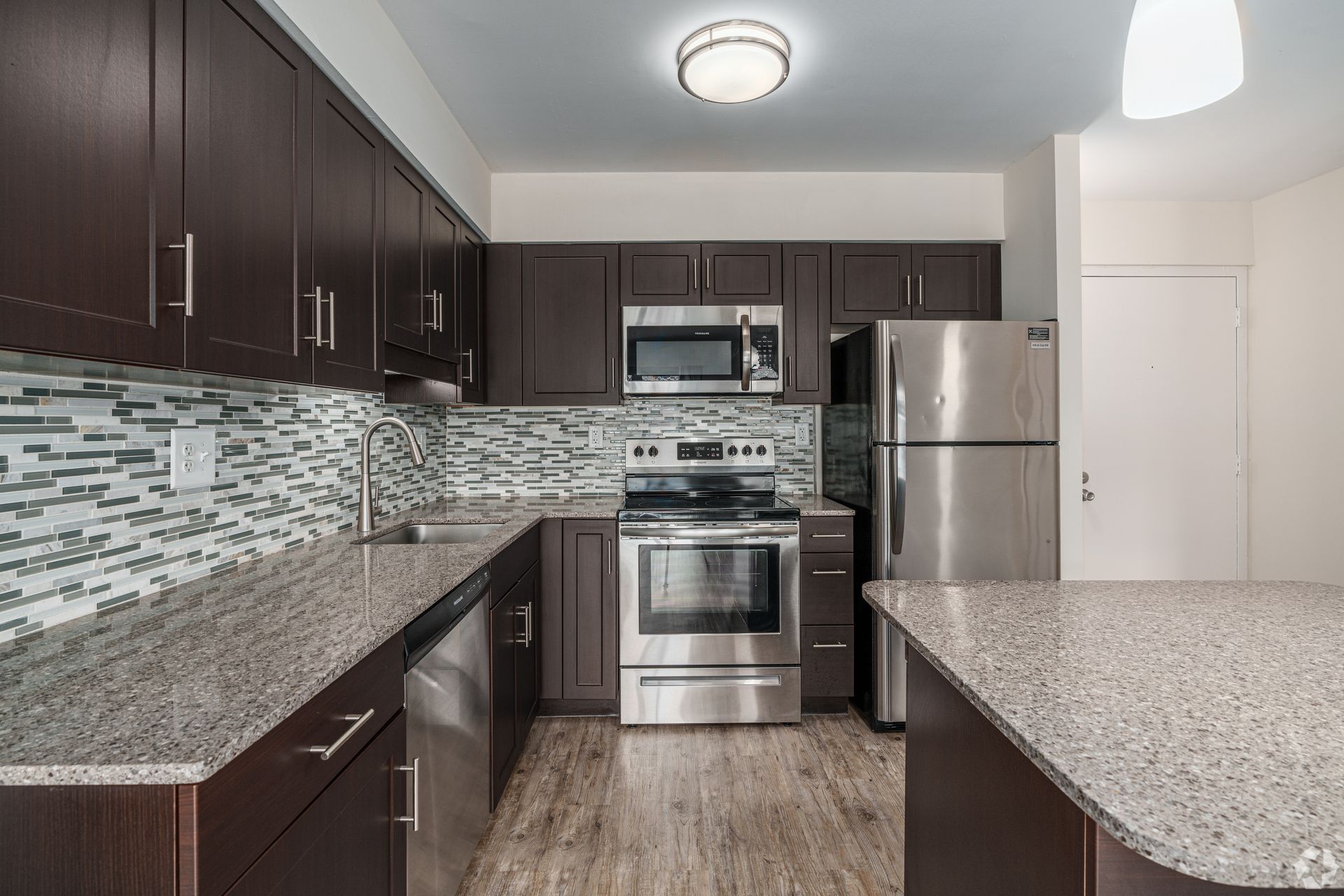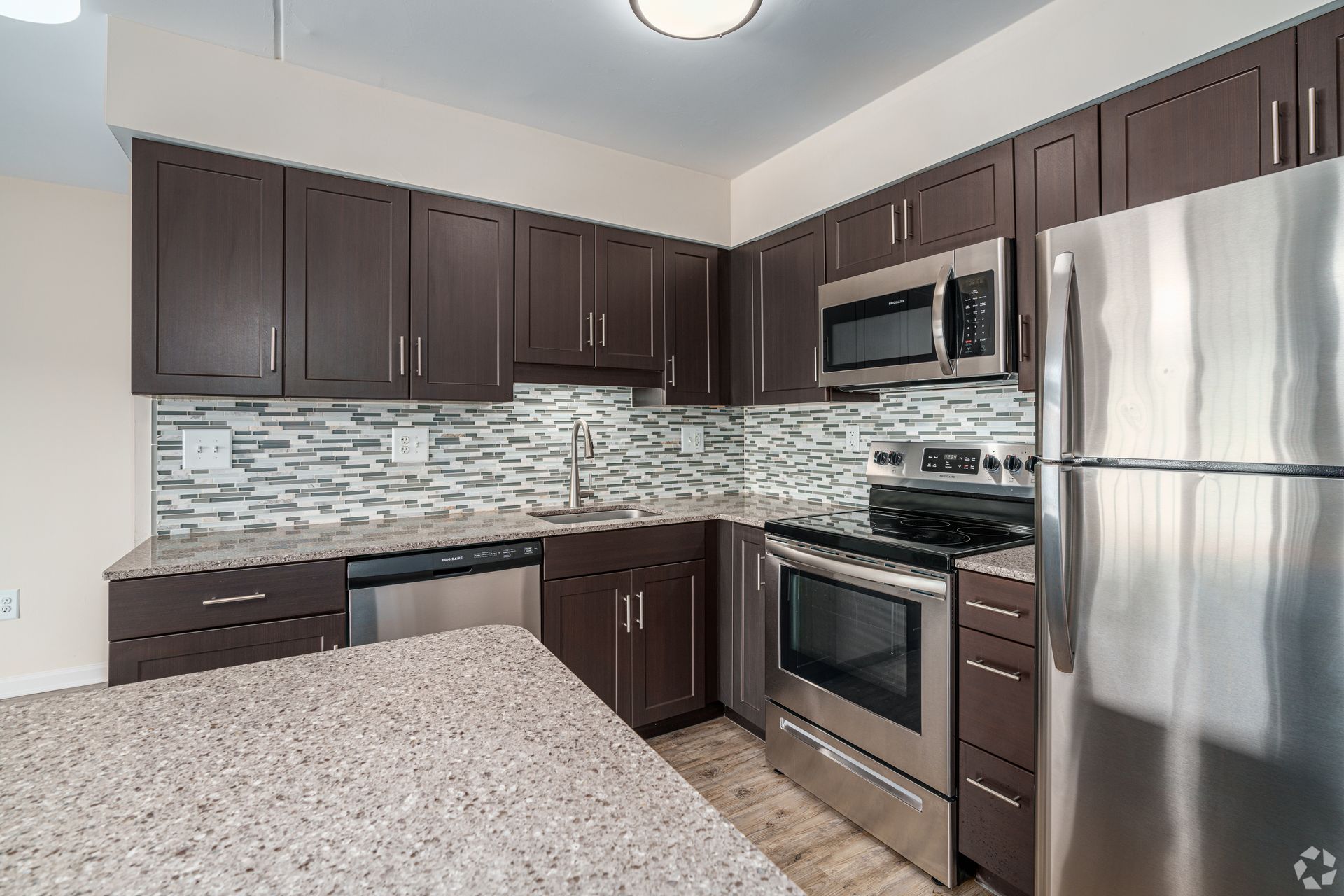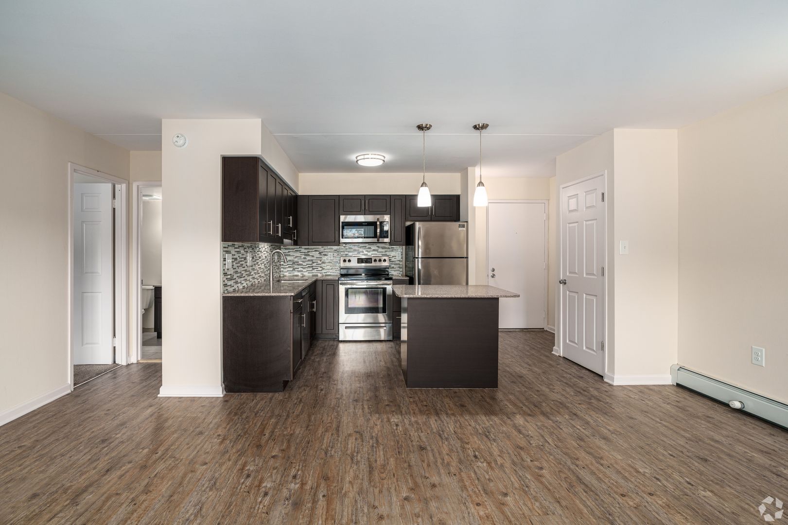 Our units have been completely renovated to meet today’s standards of living. Offering fully equipped kitchen with stainless steel appliances, including; refrigerator with ice maker, stove with self cleaning oven, stovetop microwave, dishwasher, garbage disposal, quartz counter tops with tile back splash, ample cabinetry with soft closing mechanisms, and kitchen islands with pendant lights. Vinyl plank flooring in the kitchen and living room are contrasted with new carpeting in the bedrooms with walk-in closet. There is also a linen and coat closet, and full size washer & dryer in the unit. Ceramic tile in the bathroom and a full size vanity with quartz countertop finish off a contemporary style in each apartment. Each unit also has its own balcony/patio with a spacious storage closet. Second and third floor units have non-functioning fireplaces.